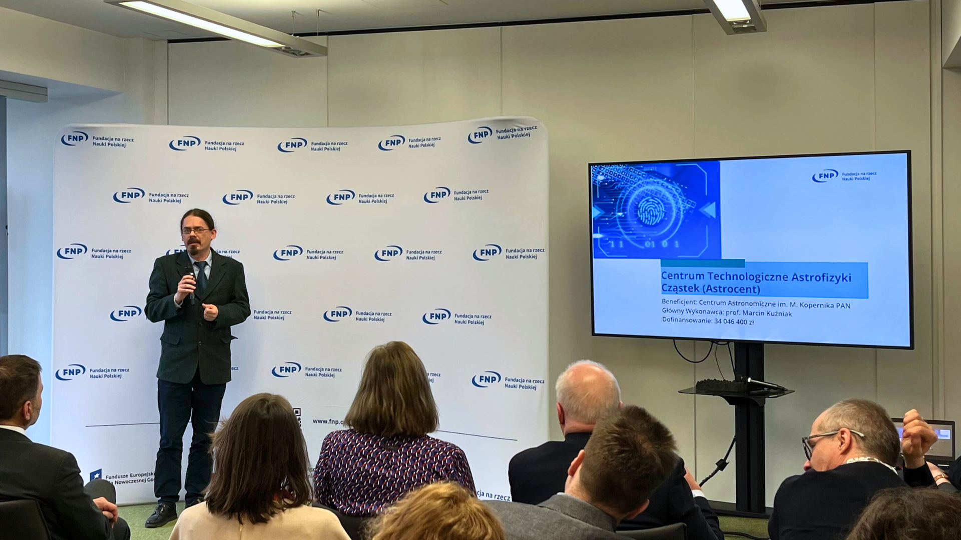 On 24 February 2026, we had the pleasure of participating in the meeting organized by the Foundation for Polish Science (FNP) for beneficiaries of the International Research Agendas Programme (IRAP). During the event, our project leader, Prof. Marcin Kuźniak, delivered a short presentation on the newly awarded project “Astrocent – Particle Astrophysics Technology Centre.”